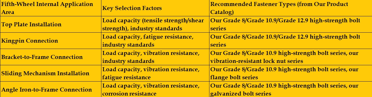 Beşinci tekerlek sistemi, güvenli ve verimli ulaşım için gerekli olan traktör ve römorkun bağlanmasında önemli bir rol oynar. Uygun bağlantı elemanlarının doğru bir şekilde seçilmesi, bu bağlantının bütünlüğü ve hizmet ömrü için hayati önem taşır, bu da doğrudan güvenlik ve operasyonel güvenilirliği etkilemektedir. Bu bülten, beşinci tekerlekli uygulamalar için bağlantı elemanlarını seçerken dikkate alınması gereken temel faktörler aracılığıyla şirketimizin ürün kataloğuna dayanarak müşterilere rehberlik etmeyi amaçlamaktadır.